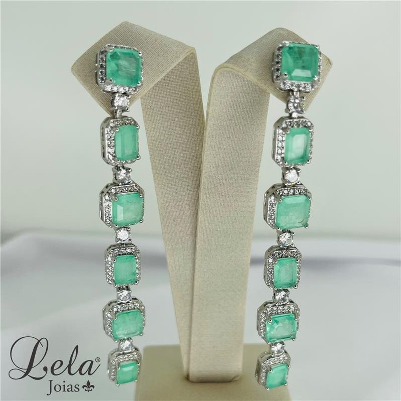 BRINCO LONGO PEDRA FUSION ESMERALDA COLOMBIANA CRAVEJADO COM ZIRCÔNIAS BRANCAS FOLHEADO A RÓDIO BRANCO
