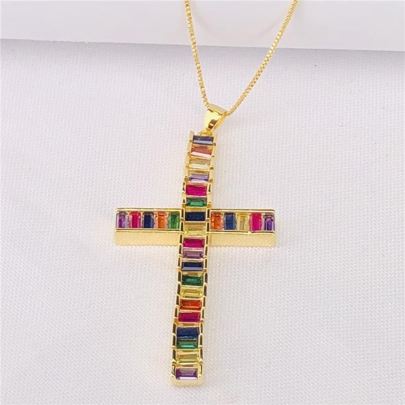 CORRENTE COM PINGENTE DE CRUZ NAVETES COLORIDAS FOLHEADO A OURO