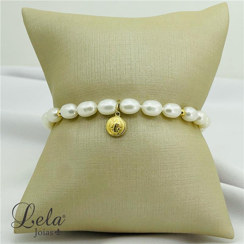 PULSEIRA DE PÉROLA COM PINGENTE DE SÃO BENTO EM OURO 18K